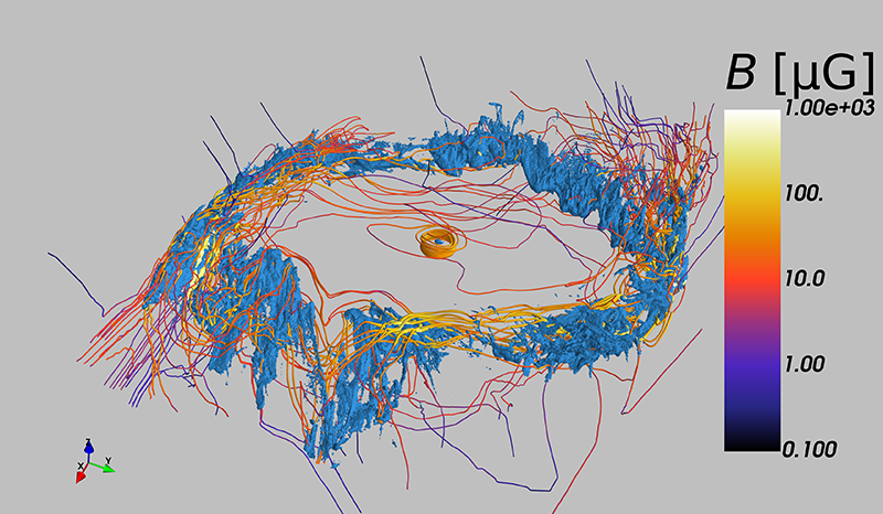 Figure 8: Face-on and edge-on views of the interstellar medium in the central region of the simulated Milky Way analogue.The magnetic field lines are superimposed on the gas distribution. This structure is the so called “Central Molecular Zone” and it is fuelled by the gas streams seen coming in at the edges of the image, induced by the Galactic bar.